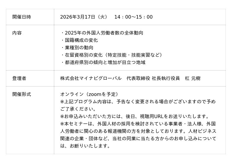 そこで本セミナーでは、2026年1月末に公表された同統計を基に在留資格や国籍の変化、業種別・都道府県別の動向など多角的な視点から外国人雇用状況の実態および背景について、株式会社マイナビグローバル 代表取締役社長執行役員・杠元樹が詳しく解説します。