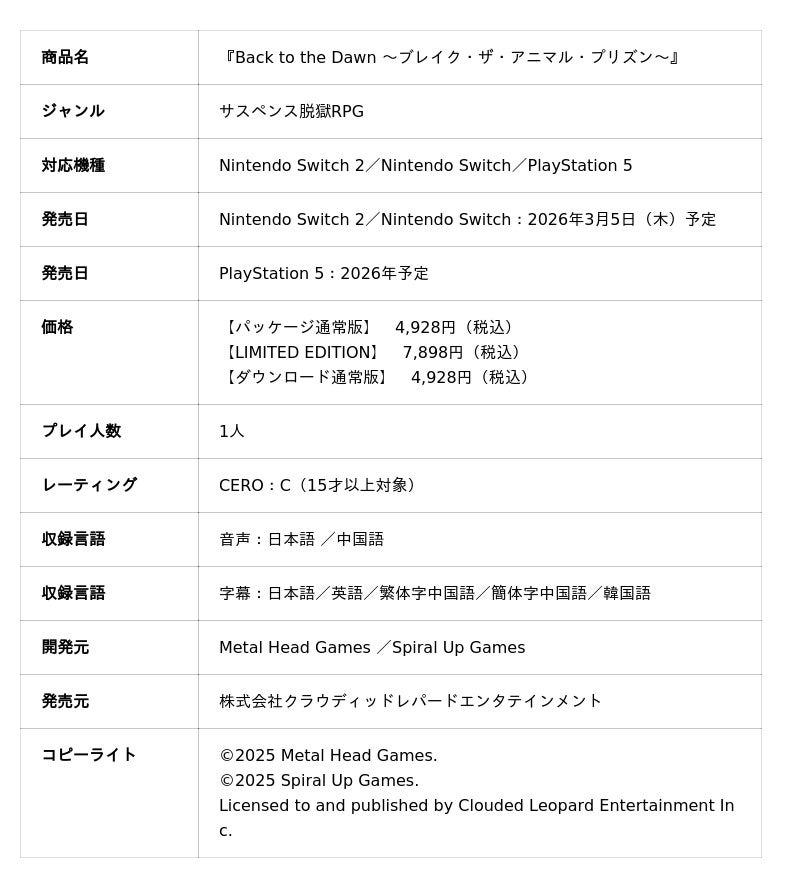 株式会社クラウディッドレパードエンタテインメント(本社:東京都品川区、代表取締役:陳 云云)は、Metal Head Gamesが開発する、サスペンス脱獄RPG『Back to the Dawn ~ブレイク・ザ・アニマル・プリズン~』(以下『Back to the Dawn』)を明日2026年3月5日(木)に発売します。