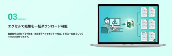 チェックの結果はエクセルで一括ダウンロードが可能。結果と対応する手順書/承認書の箇所をペアにしてセットで抽出するという。エクセルでの出力が可能なため、レビュー記録としても活用できるとしている。