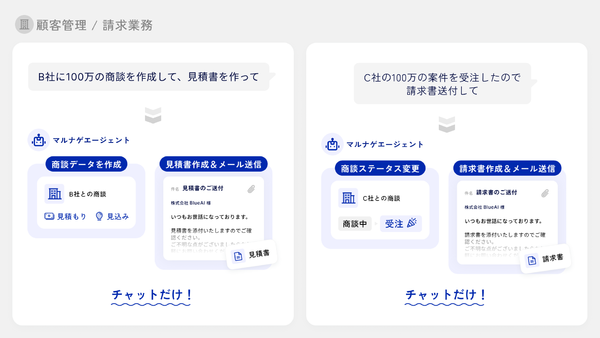「マルナゲ」では複数の業務をひとつのアカウント、ひとつのUIで利用可能にするという。プロダクト間のデータは自動連携されるため二重入力が不要。例えば、AIエージェントに「A社の請求書を作成して」、「B社の商談お礼メール送って」、「C社の見積もり書作成してメール送付して」とチャット形式で指示するのみで、該当する複数のプロダクトの操作をAIが代行し、作業を実行するという。