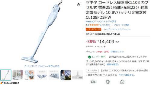 マキタのコードレス掃除機「CL108FDSHW」がAmazonで割引対象。参考価格23,100円のところ、38%オフの14,409円で販売中。