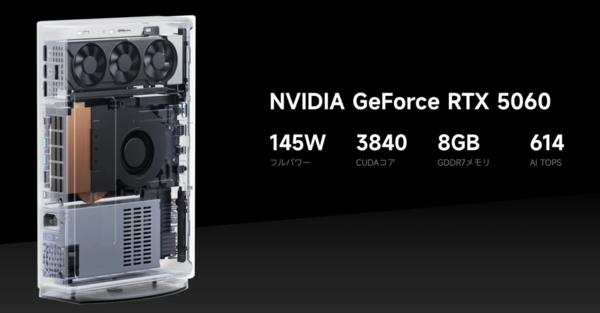 AtomMan G1 Proには、AMD Ryzen 9 8945HXと、驚くべきことにデスクトップ向けのGeForce RTX 5060が搭載されています。ゲーミングミニPCの多くが発熱を抑えるために「ノートPC向け(モバイル版)GPU」を採用するなか、本機は妥協せずにデスクトップ版を積んでいるため、描画性能はまさに本物。
