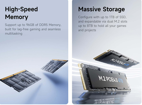 CPUとGPUがこれだけ強力だと、他のパーツがボトルネックにならないか心配になりますが、AtomMan G1 Proにその心配は無用です。標準でDDR5-5200 MHz 32GBの高速メモリーと、1TBのNVMe SSDを搭載!