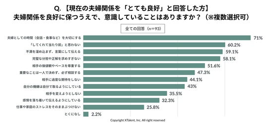 「関係をとても良好」と回答した人が、良好に保つために意識していることの1位は「夫婦としての時間を大切にする(71%)」。次いで、「してくれて当たり前と思わない(60.2%)」、「不満を溜め込まず、言葉にして伝える(59.1%) 」があげられました。