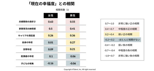 世帯年収よりも、夫婦関係の良好さ(相関係数:女性=0.63、男性=0.55)が幸福度に直結。
