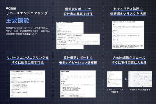 「Acsim リバースエンジニアリングサービス」は、設計書やドキュメントが失われたレガシーシステムに対して、AIがソースコードと業務情報を解析・構造化し、設計資産を短期間で再構築・提供するサービスです。累計1億行超のソースコード解析実績を持つAI基盤を活用し、API設計書、機能設計書、業務フロー、セキュリティ診断レポート、改善提案書など27種類以上の成果物を最短2週間で生成します。成果物には、信頼度スコアや改善優先度、設計意図に関するドキュメントも付与され、現状の可視化にとどまらず、次のアクションを見据えた判断や再設計を支援します。