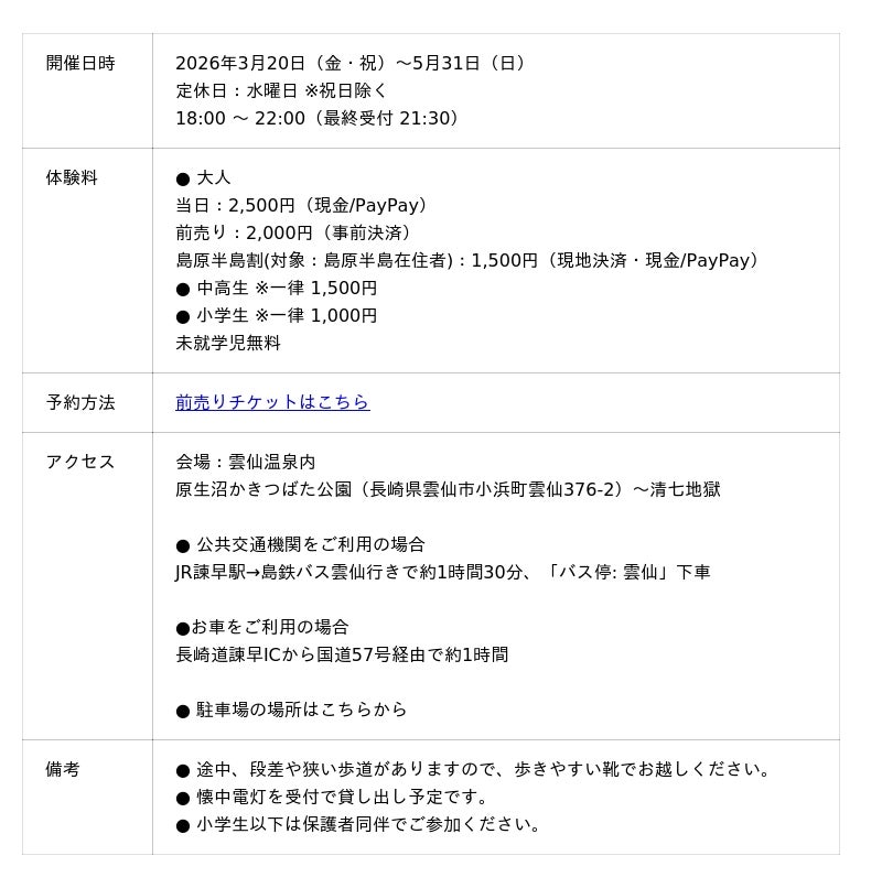 国立公園・雲仙地獄を舞台にした没入型デジタルナイトイベント「ボルケーノナイトウォーク ~光と映像が紡ぐ、夜の物語~」を、2026年3月20日(金・祝)から5月31日(日)まで開催いたします。