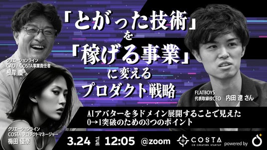 「FLATBOYS社の内田代表率いるチームの熱意と、彼らが生み出すAIアバターの可能性に強く惹かれ、今回の共創に至りました。FLATBOYS様の尖った技術と、当社のエンジニアリング力が組み合わさることで、社会に大きなインパクトを与えるサービスが生まれると確信しています。COSTAを通じて、彼らの挑戦を全力で支援してまいります。」