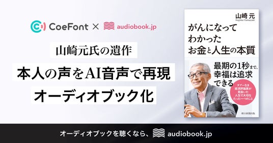 AI音声サービス「CoeFont」を提供する株式会社CoeFont(本社:東京都港区、代表取締役:早川尚吾、以下「CoeFont」)は、株式会社オトバンクが制作・配信を行う、経済評論家・山崎元氏の遺作『がんになってわかった お金と人生の本質』のオーディオブック制作において、AI音声技術による技術協力を無償で行ったことをお知らせします。本プロジェクトは、audiobook.jpを運営する株式会社オトバンクとの共同プロジェクトです。