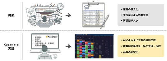 データに基づき最適化され続けるダイヤの提供のみならず、これまでダイヤ表作成に要していた時間の削減につながると同時に、従来発生しやすかった手作業による修正や条件の見落としに伴う再調整の抑制、作業の手戻り防止につながると考えられます。さらに、AIを用いることで代替案や修正案を迅速に生成できるようになり、従来よりも柔軟かつ効率的な対応が可能になります。