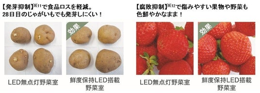 ※11:試験条件/AQR-TXA50A(鮮度保持LEDを野菜室に搭載)と常温を想定したフィールド試験室(15~30℃)に設置し、1台では鮮度保持LED照射有り、もう1台では鮮度保持LED照射無しとして運転(冷蔵室の設定:中、冷凍室の設定:中)。野菜室のバスケットにじゃがいもを28日間保存した後の外観を評価しました。当社調べ。