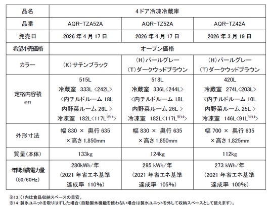 アクア株式会社(本社:東京都中央区、代表取締役社長 兼 CEO:杜 鏡国)は、日本を代表するプロダクトデザイナー・深澤直人氏がデザインを手掛けた薄型設計冷凍冷蔵庫「TZシリーズ」の2026年モデル(AQR-TZA52A/TZ52A/TZ42A)を、2026年3月19日(木)より順次発売いたします。