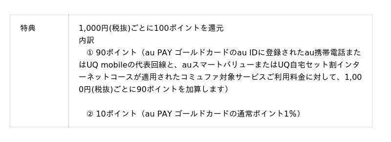 コミュファ対象サービスに加入いただき、au PAY ゴールドカードでコミュファご利用料金のお支払い設定を完了し各種条件を達成すると最大3ヵ月分の10%特典還元を受けられます。