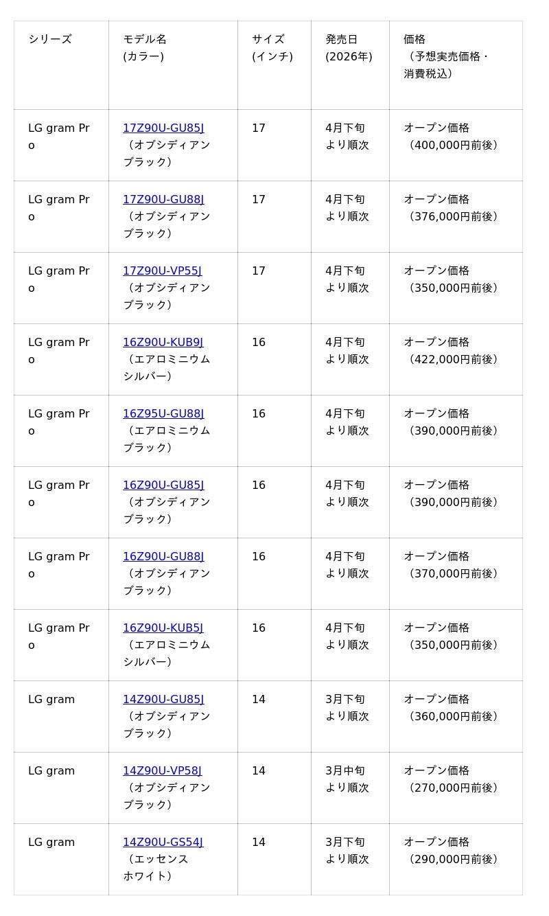 【「LG gram」2026年ラインナップについて】