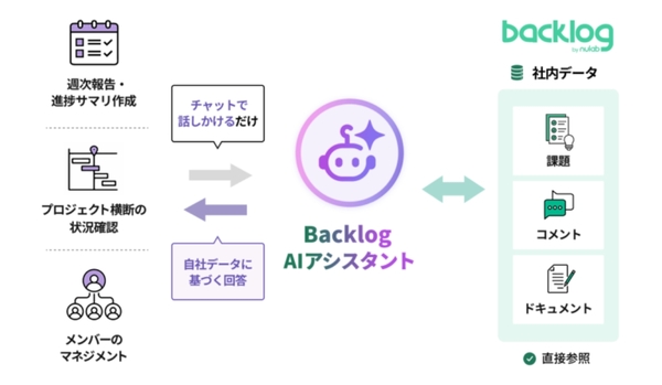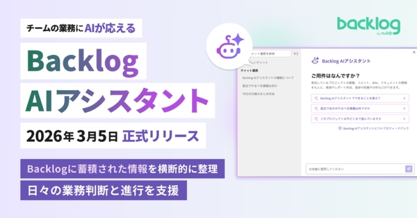 ヌーラボは、2026年03月05日、プロジェクト・タスク管理ツール「Backlog」において、同ツールの運用を支援するAI機能「Backlog AIアシスタント」を提供開始した。同機能は、Backlog上の課題やコメント、Wiki、ドキュメントなどをAIが読み取り、対話形式で状況整理や要点抽出、課題作成を任せられるAIアシスタントである。