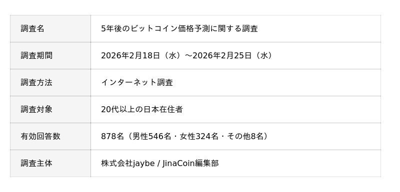 株式会社jaybe(本社:香川県高松市、代表取締役:水澤 誉往)が運営する暗号資産(仮想通貨)ニュースメディア「JinaCoin」(https://jinacoin.ne.jp/)は、20代以上の日本在住者878名を対象に、暗号資産の保有実態および将来の価格予測に関するインターネット調査を実施しました。