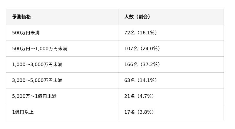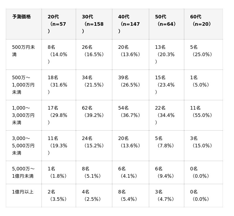 全年代で1,000万円以上予測が過半数を超えています。特に60代はサンプル数が少ないものの、70.0%が高い価格帯を予測しました。 また、5,000万円以上の超強気予測は50代が14.1%と全年代で最も高くなりました。