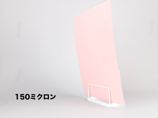まずは全体の強度。同じようにラミネート加工したものをスタンドに立ててみましたが、その差は歴然。100ミクロンは柔らかく曲がってしまいますが、150ミクロンは下敷きのような硬さがありました。100ミクロンがクリアファイルだとすれば、150ミクロンは硬質カードケースといった感じでしょうか。