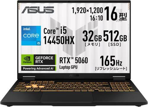 RTX 5060にメモリ32GB。この組み合わせだと、ゲーミングノートでは価格がもう少し上になることも多い。ASUSの「TUF Gaming F16」はCore i5-14450HXを搭載した16型モデル。RTXノートを見ていると、このスペックでこの価格というところは気になる人も多いはず。
