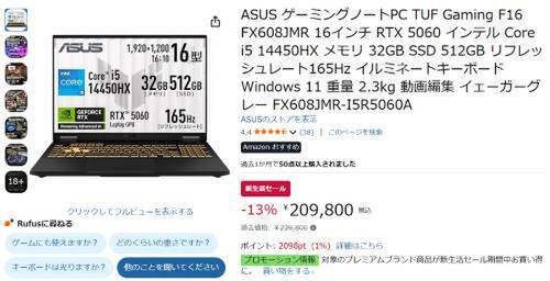 ASUSの16型ゲーミングノートPC「TUF Gaming F16(FX608JMR)」がAmazon新生活セール対象。過去価格239,800円のところ、13%オフの209,800円で販売中。