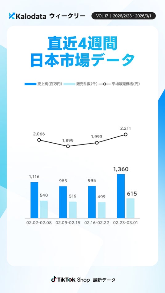 Kalodata Japan(運営:株式会社Kalowave Japan)の最新データによると、2026年2月23日~3月1日の日本TikTok Shop市場はGMV13.6億円(前週比+36.67%)を記録しました。