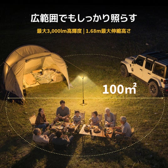 2.街灯のような明るさ。高さ調整も自由自在 3つのパネルが放つ3,000ルーメンという圧倒的な明るさを実現。まるで街灯のように広範囲を照らします。また、内蔵ポールは168cmまで伸ばせるため、これ1台で100平方メートル の広さをカバーできます。そのため、夜のバーベキューやグループキャンプでも、足元から手元までしっかり照らし、安心して過ごせる明るさを確保できます。