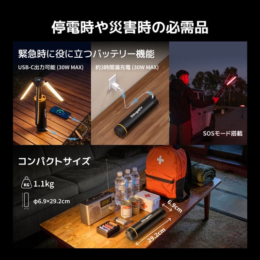 さらに、緊急時に役立つSOSモードも備え、いざという時の安心をサポートします。本体は1.1kg、直径6.9×高さ29.2cmのコンパクト設計で、防災バッグにも収納しやすいサイズ。アウトドアはもちろん、防災備蓄としても活躍する一台です。