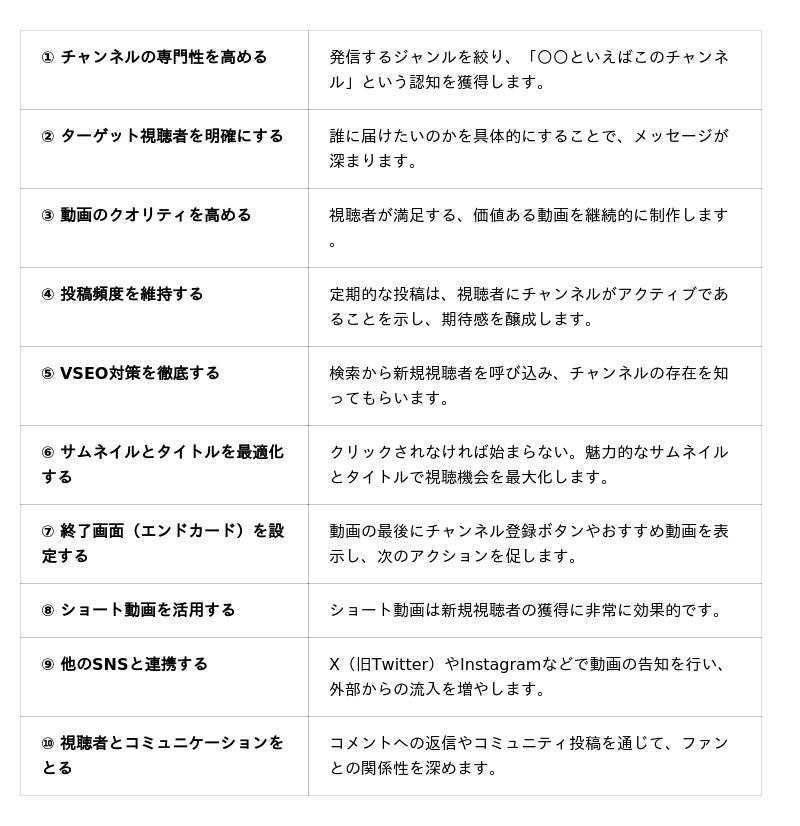 本コンテンツでは、初心者がすぐに取り組める基本的な施策から、中~上級者向けのテクニックまで、チャンネル登録者を増やすための具体的な方法を10個に厳選して紹介します。