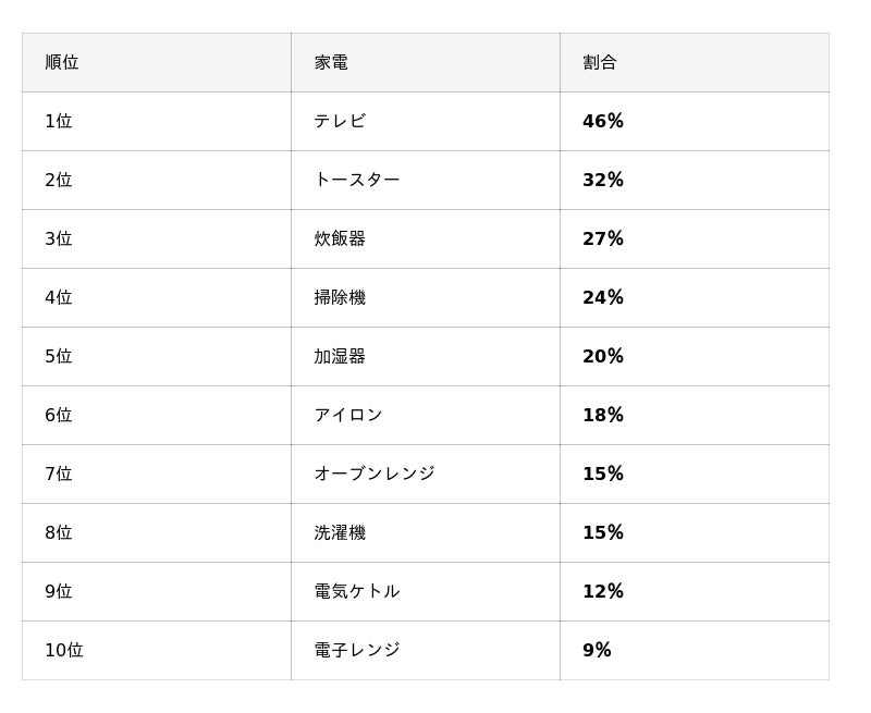 テレビやトースターなどは最初から購入しない人が多い一方、電子レンジや掃除機などは生活してから必要性を感じて購入するケースも見られます。