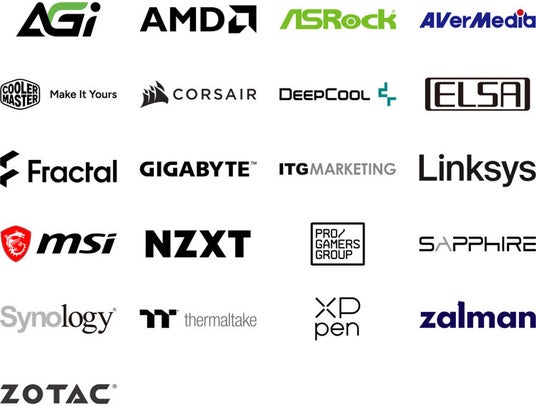 AGI、AMD、ASRock、AVerMedia、Cooler Master、CORSAIR、DeepCool、ELSA、Fractal Design、GIGABYTE、ITGマーケティング、Linksys、MSI、NZXT、Pro Gamers Group、SAPPHIRE、Synology、Thermaltake、XPPen、ZALMAN、ZOTAC
