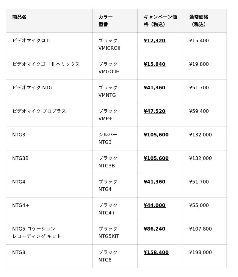 ※ワイヤレスマイクシリーズ、ステレオビデオマイクは、本キャンペーンの対象外です。