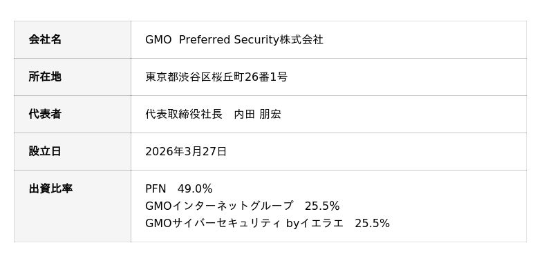 株式会社Preferred Networks(代表取締役社長:岡野原 大輔、以下 PFN)、GMOインターネットグループ株式会社(代表取締役グループ代表:熊谷 正寿、以下 GMOインターネットグループ)、および、GMOサイバーセキュリティ byイエラエ株式会社(代表取締役社長:牧田 誠、以下 GMOサイバーセキュリティ byイエラエ)は、2026年3月2日(月)に、資本業務提携、並びに、合弁会社「GMO Preferred Security株式会社」(以下 本合弁会社)設立に合意いたしました。