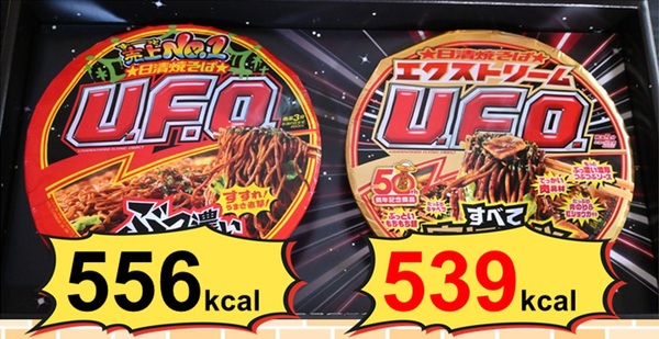 なお、カロリーは定番U.F.O.が556kcalで、エクストリームU.F.O.が539kcalと、具材増量、ソース濃さ増しなのに、エクストリームのほうが低カロリー(微差ですが)でした。不思議。これもエクストリームのなせる技かも。