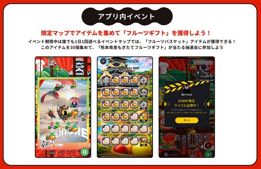 コラボ限定マップが登場!くまモンがライバルとして出現するなど、毎日のプレイがもっと楽しめます。コラボマップで獲得できる限定アイテムを集めて「熊本県産のフルーツ詰合せギフト」が当たる抽選会に参加できるほか、くまモンをモチーフにデザインされた限定クローズ(アプリ内アバター衣装)も登場します。イベントマップは熊本県外でもプレイ可能です。