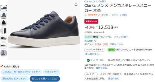 Clarksのレザースニーカー「Un Costa Lace(アンコスタレース)」がAmazon新生活セール対象。参考価格20,900円のところ、40%オフの12,538円で販売中。