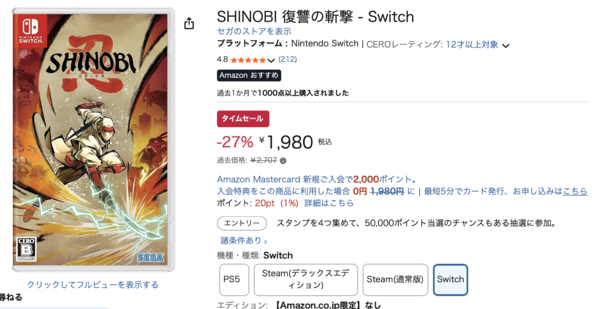 というわけで、今回はオススメの忍者ゲーです。「SHINOBI 復讐の斬撃」。Switch版の過去価格が2,707円のところ、タイムセールで27%オフの1,980円で購入できます(3月6日現在)。