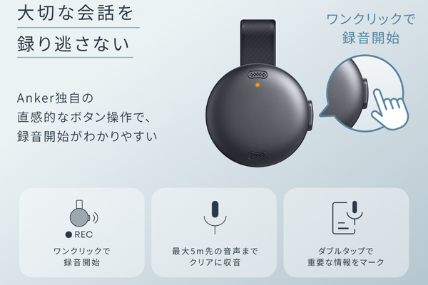 自分自身も重さを全く感じないため、商談中も存在を忘れて自然な振る舞いができます。対面でのインタビューや移動中のメモ代わりなど、日常のあらゆるシーンに溶け込むデザインは、さすがプロダクトデザインに定評のあるAnkerといったところでしょう。