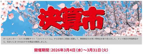 コメリの「決算市」は、新生活家電から園芸用品、工具、日用品まで幅広く掲載されているセール。期間は3月31日までとなっている。