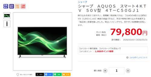 シャープ「AQUOS スマート4Kテレビ 50V型 4T-C50GJ1」