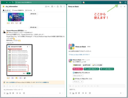 Slackの右上に表示されるParty on Slackのアイコンをクリックすると、チャンネル画面の横にAIとの会話パネルが表示されます。いわゆるスプリットビュー形式で、チャンネルの会話内容を確認しながら、同時にAIへ質問や依頼を行うことが可能です。