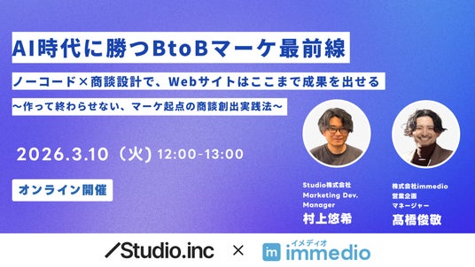 株式会社immedio(本社:東京都渋谷区、代表取締役:浜田 英揮)は、2026年3月10日(火)、Studio株式会社とAI時代に勝つBtoBマーケ最前線ノーコード×商談設計で、Webサイトはここまで成果を出せる~作って終わらせない、マーケ起点の商談創出実践法~を開催いたします。