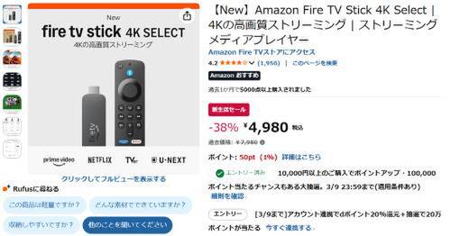 Amazonのストリーミング端末「Fire TV Stick 4K Select」が新生活セール対象。参考価格7,980円のところ、38%オフの4,980円で販売中。