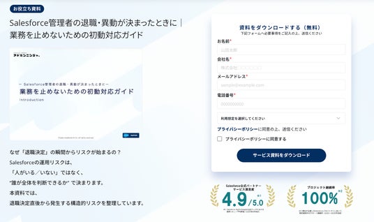 Salesforce管理・運用・保守のアウトソースサービス「アドミンニンジャ」を提供する株式会社セールスイネーブルメントが、Salesforce管理者の退職・異動時の初動対応をまとめた実務ガイドを公開