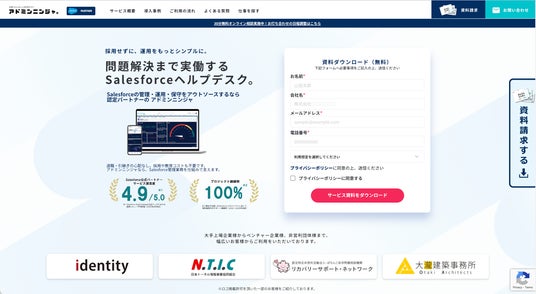 Salesforce認定アドミンによる定額管理者代行サービス『アドミンニンジャ』は、月額10万円からご利用いただけるサービスとして、幅広い企業様に導入いただき、公式パートナー評価4.9/5.0、プロジェクト継続率100%を記録しています(2026年3月9日現在)。