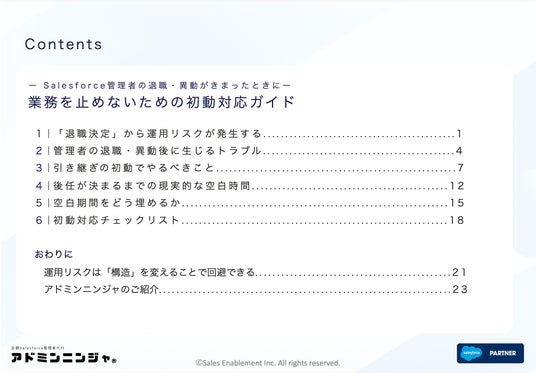 株式会社セールスイネーブルメント(本社:東京都中央区、代表取締役:井内 駿佑、以下「当社」)は、Salesforceを利用する企業向けに、「Salesforce管理者の退職・異動が決まったときに業務を止めないための初動対応ガイド」を公開いたしました。