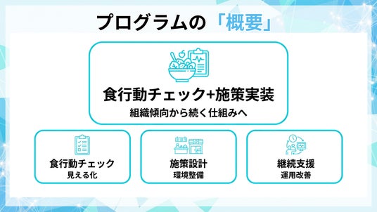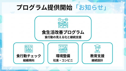 本プログラムは、食行動を起点に組織単位の傾向を把握し、環境整備と教育で「続く仕組み」を作る食生活改善支援です。