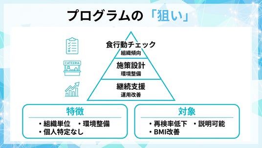 本プログラムは、食行動を組織単位で見える化し、社食・コンビニ導線・教育を組み合わせて継続支援し、再検率の低下とBMI分布の改善を狙う食生活改善支援です。