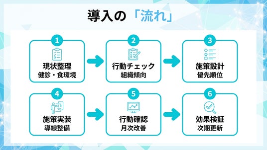 本プログラムは医療行為(診断・治療)を提供するものではありません。個人が特定されない組織単位の集計を前提に、食環境と行動の改善を支援し、健診指標等の推移で効果を検証します。