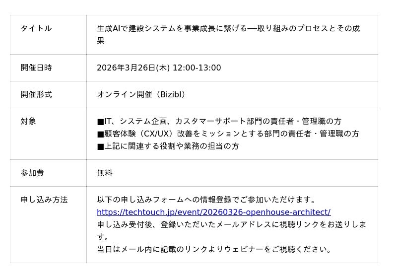 お申し込みはこちら:https://techtouch.jp/event/20260326-openhouse-architect/