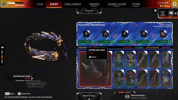 武器スキンはR-99、R301、ランページ、ディヴォーション、ピースキーパー、マスティフ、G-7スカウトなどがラインアップされている。
